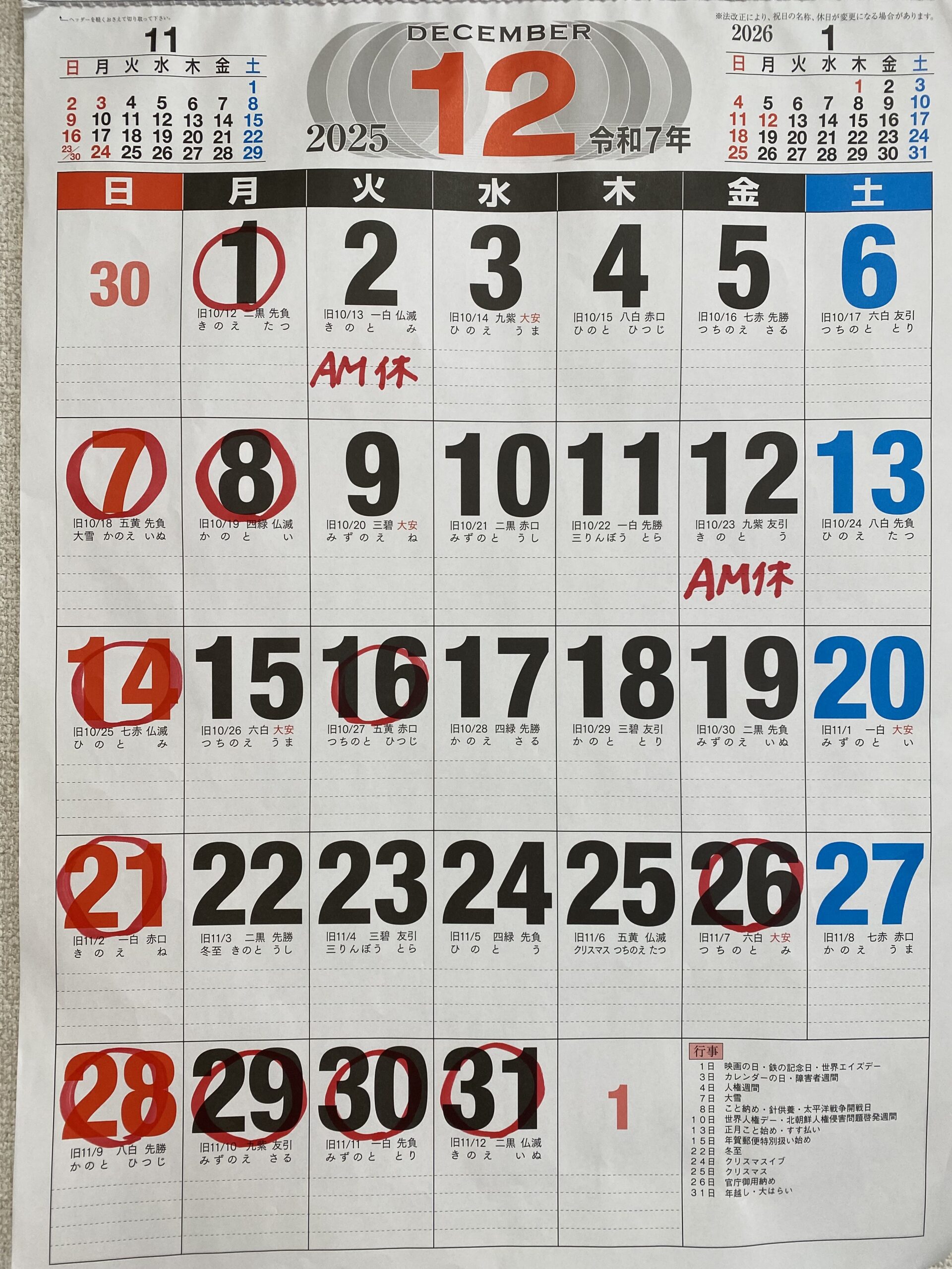 平日の休みについては都度変更となりますので